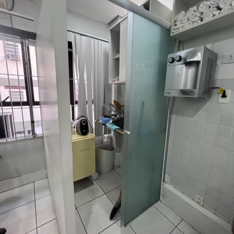 Uma repaginada com um ar industrial era a ideia dessa sala comercial. Para esse salão que funciona em sala comercial, a inspiração veio dos lofts de Nova York. Revestimentos atemporais e neutros combinados com marcenaria e luminárias pretas e estofados verde deram esse ar industrial no ambiente. Projeto com parceria com Vladia Cimbalista.
